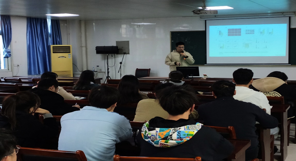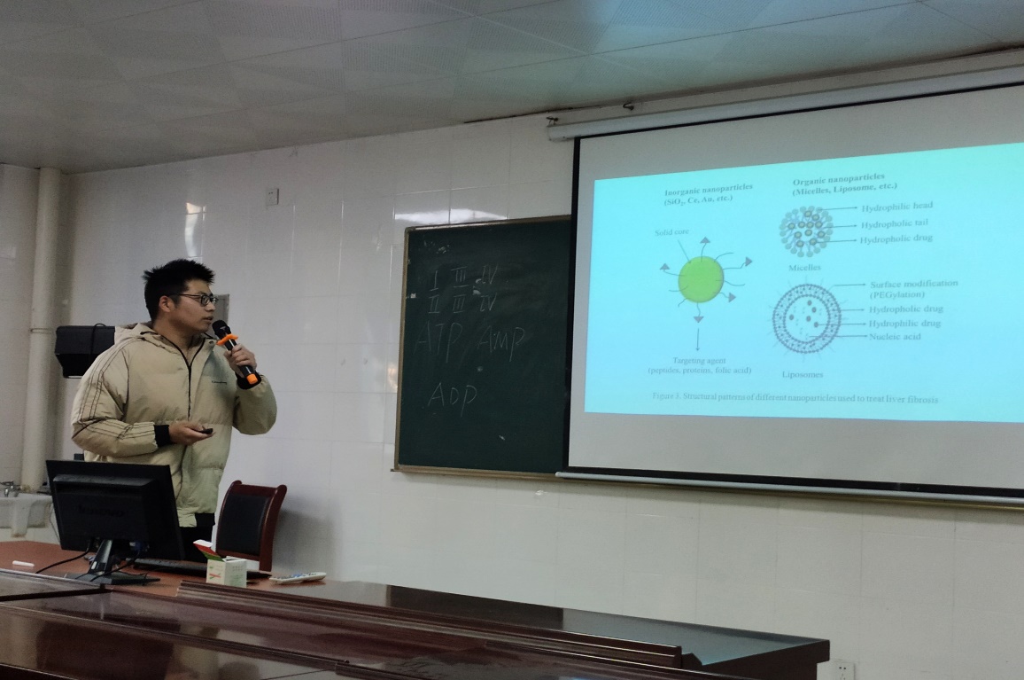 2019级研究生彭威作了题为“Application of nanomaterials in liver fibrosis”的学术交流报告,学院教师、研究生、参与大学生创新训练计划项目的本科生参加了本次活动的学习交流。