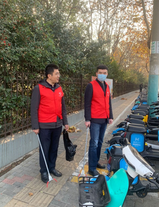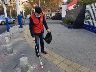 教师党员刘高峰、高宇到蚌埠医学院西指定路段开展以捡拾一个烟头、清扫一处垃圾、清除一块牛皮癣、消除一处痰迹、擦拭一处污秽、摆放一辆非机动车、劝导一个不文明行为为主题的文明实践志愿服务活动。