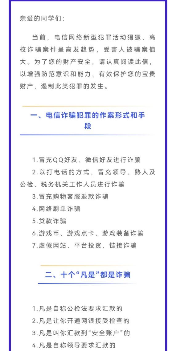 持续深化校园反诈骗宣传教育,提升广大师生反诈防骗能力,切实保障师生合法权益,坚持以人民为中心,统筹发展安全,强化系统观念、法治思维,注重源头治理、综合治理,坚持齐抓共管,群防群治,积极推进“无诈校园”建设。