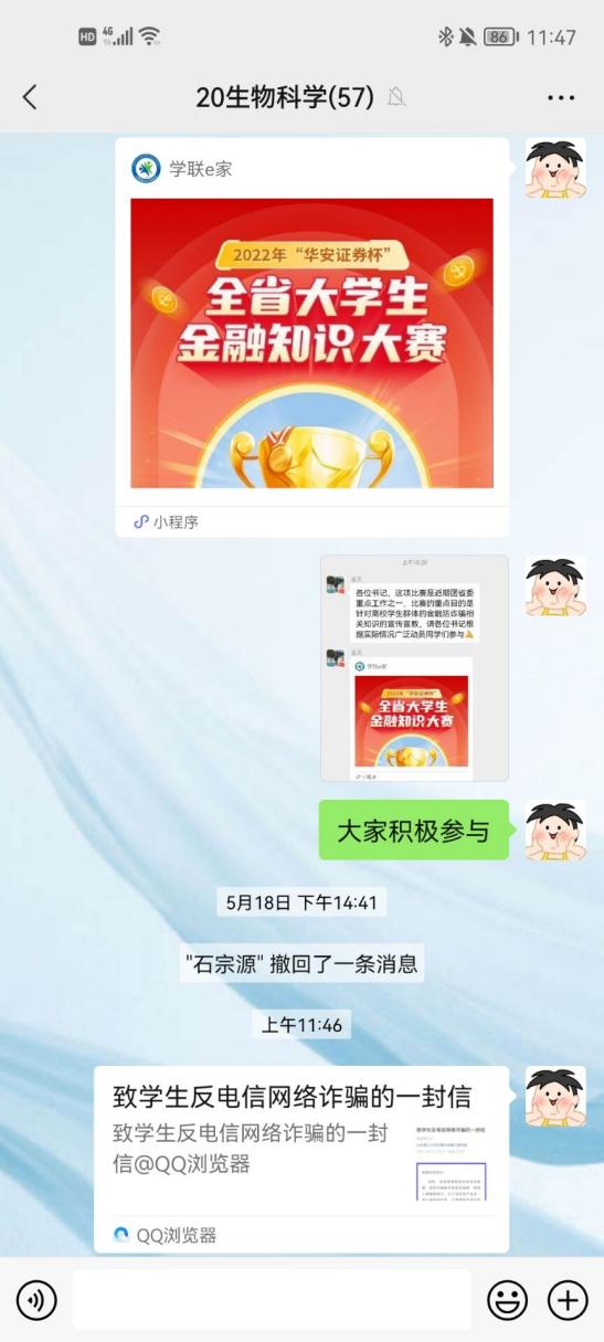 活动三:线上线下通过 QQ、微信等平台,致学生“防范电信网络诈骗温馨提示”一封信,提醒大学生时刻警惕,注意防范。