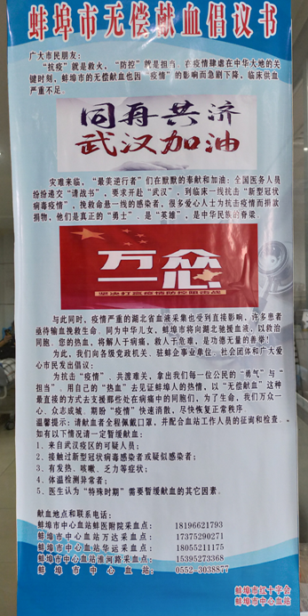 蚌埠医学院附属医院医疗支援队毅然选择逆行驰援武汉一线,顶着巨大的压力和风险到湖北抗击疫情。广大师生深受教育和感染,积攒着满腔热情,敬佩医院医疗护理工作者不计危险不怕牺牲勇敢抗击疫情,以勤奋学习和志愿服务,向防疫一线奋斗的医务工作者学习。教师党员也多次献血。