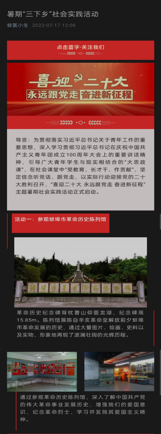 通过线上活动的开展,同学们在思想教育上都有了较大的收获,更加清楚的了解中国特色社会主义思想取得的伟大成就,在下一阶段,我们将在线下集中开展爱国教育实践活动,分别是参观蚌埠市革命历史陈列馆和登涂山回味红军长征,切实的感受先辈所经历的事物,让同学们懂得珍惜今天来之不易的幸福生活,刻苦学习、努力奋斗,以实际行动迎接党的二十大胜利召开。