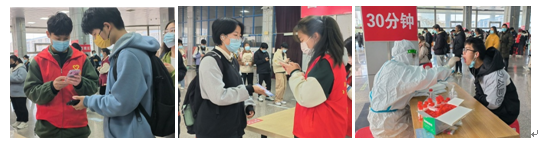 志愿服务时间为13:00-16:30,志愿者们提前半小时到达并确定好任务分配。在活动中,志愿者耐心的提醒同学们佩戴口罩、排好队、保持距离、有序进行核检,为快速完成核检,志愿者们不断提醒排队同学提前打开安康码或者预约码,方便快速信息的录入,在志愿者和医护人员的共同努力下,核酸检测采样工作顺利完成。