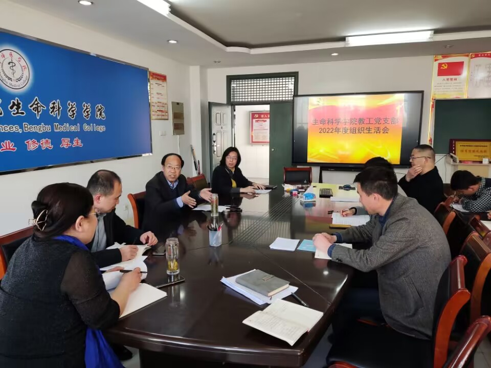 教工党支部在学院党员活动室召开2022年度组织生活会和开展民主评议党员工作。本次会议由教工党支部书记胡明洁同志主持,蚌埠医学院副校长陈昌杰同志以普通党员身份参加组织生活会。