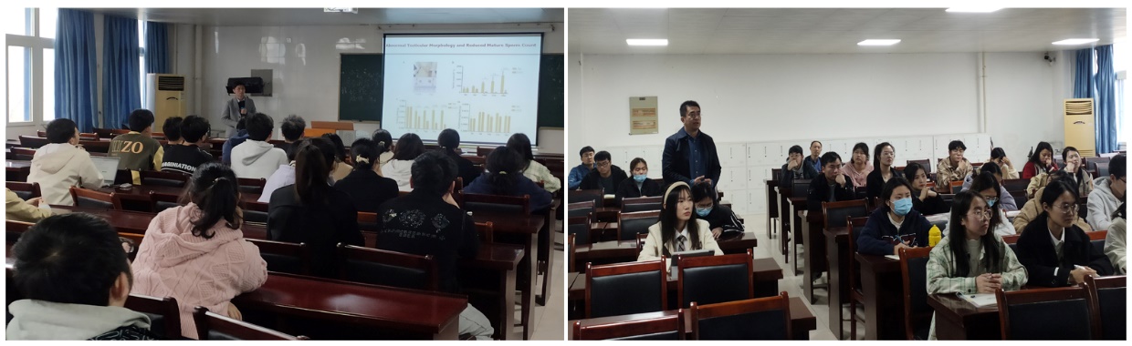梁猛教授首先讲述了热暴露会引发睾丸组织发生变性,破坏生精细胞,从而导致精子发生障碍。课题组利用TM4细胞研究表明,热暴露后细胞发生凋亡,显微结构受到破坏,通过转录组分析表明其发生过程与Hippo信号通路相关。接着,详尽阐述了其课题组利用隐睾小鼠模型和精索静脉曲张大鼠模型研究了这些因素对睾丸和生精细胞的影响而引发的生精障碍,通过转录组分析筛选出Azin2基因,并进一步利用GC1细胞模型研究了该基因对生精障碍的影响,探究了其可能的机制。最后,梁猛教授对与会老师、研究生、本科生提出的问题进行了详尽的解答和交流。整场报告内容丰富,听着意犹未尽。