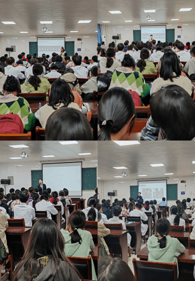 在F座310教室召开2024年优秀校友分享交流会,2024级150名新生参会,分享会由年级主任王荣老师主持。