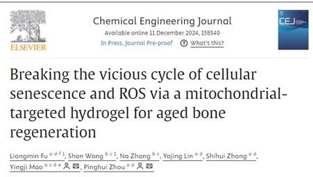 针对衰老骨缺损修复难题,我院毛颖基/周平辉课题组设计出了一种新型的线粒体靶向水凝胶—TPG@ChSMA水凝胶,通过平衡活性氧(ROS)水平并改善线粒体功能,逆转细胞衰老,促进骨再生,解决了衰老骨再生中的关键瓶颈问题。相关研究成果以“Breaking the Vicious Cycle of Cellular Senescence and ROS via a Mitochondrial-targeted Hydrogel for Aged Bone Regeneration”为题,于12月12日发表在国际权威期刊《Chemical Engineering Journal》 (中科院工程技术Top一区,IF: 13.4)。四虎影院
