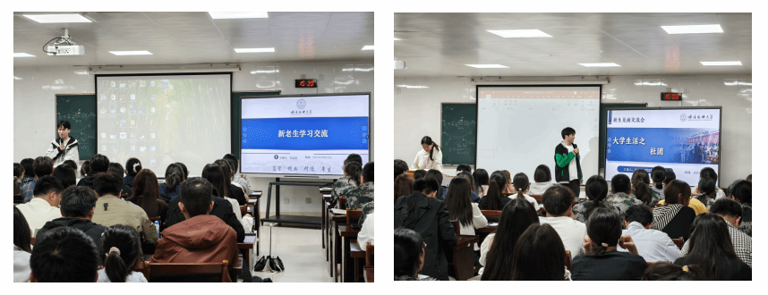 此次入学教育还特别邀请了高年级的学姐学长为新生分享大学经验。方瑜彤学姐从德智体美劳五个维度介绍了大学生活的注意要点,建议新生积极踊跃地参与竞赛和社会实践活动,同时要平衡好学习与社团活动的关系,切不可本末倒置。郑春阳学长针对新生的学习方法展开介绍,他建议新生尽早通过四六级考试,同时鼓励同学们积极投身科研项目,尽早发掘学术兴趣。孙俊芳学姐从自身科研经历谈起,详细阐述了在科研过程中应如何看待“失败”。为了让新生对学校社团有更深入的认知,马壮壮学长介绍了学校社团的情况,并呼吁大家在参加社团活动时注重投入与收获的平衡。