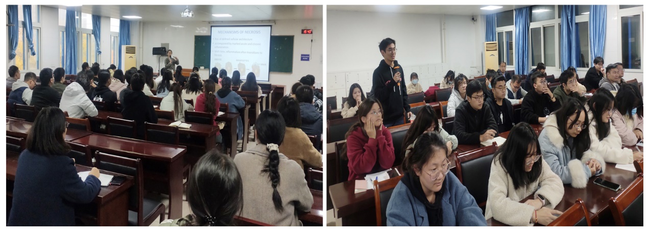 高琴教授首先通过国内外相关数据库文献检索结果表明,细胞死亡相关研究文献报道近年来呈快速增长趋势,为目前研究的热点之一,并进一步梳理了细胞死亡研究中的相关术语时间表。接着,高琴教授详尽讲述了细胞凋亡(Apoptosis)、坏死性凋亡(Necroptosis,程序性坏死)、细胞焦亡(Pyroptosis)、自噬(Autophagy)、坏死(Necrosis)、炎症性程序细胞死(PANoptosis)、铁死亡(Ferroptosis)、铜死亡(Cuproptosis)等细胞死亡方式的发现、诱因、细胞形态结果的变化及其发生机制,并介绍了在细胞死亡领域作出卓著贡献的中国科学家。最后,高琴教授对与会老师、研究生、本科生提出的问题进行了详尽的解答和交流。整场报告气氛热烈、内容丰富详实、紧接研究前沿。