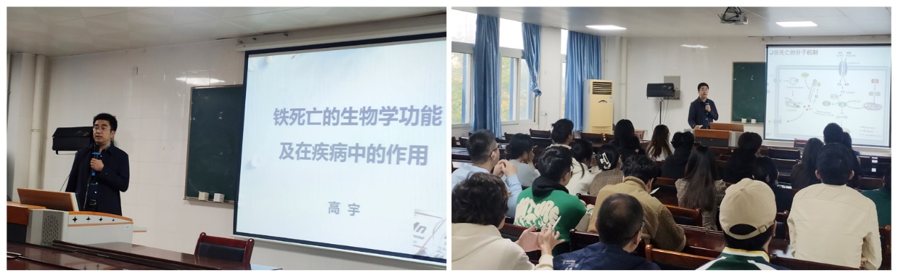 高宇教授作了题为“铁死亡的生物学功能及在疾病中的作用”的学术交流报告,学院教师、研究生、参与大学生创新训练项目的本科生参加了本次活动的学习交流。