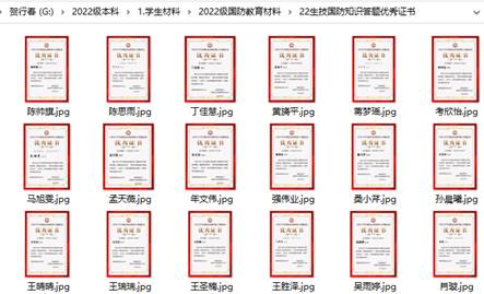 2022级全体学生通过“安徽国防动员”微信公众号进行了全校大学生国防动员知识线上答题活动,年级大部分同学获得了答题优秀电子证书。