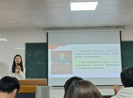 活动中,贺行春带领全体同学学习了《中华人民共和国宪法》《中华人民共和国国旗法》《安徽省学校安全条例》《国家安全法》《国防法》《反分裂国家法》《军人抚恤优待条例》等法律法规。