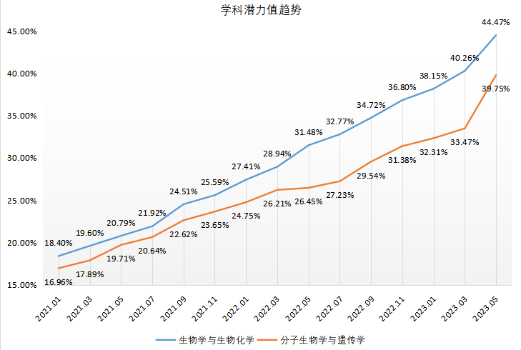 自2021年1月启动推进生物学科ESI提升工作,两年来采取有效措施推动二级学科ESI潜力值稳步提升,截止2023年5月份,生物学与生物化学(44.47%),分子生物学与遗传学(39.85%)ESI潜力值,较2021年1月提升约1.5倍。